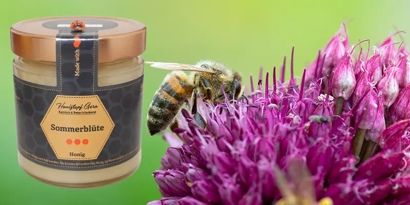 Erlebe den würzigen Geschmack der Sommertracht aus Gera. Unser Sommerblütenhonig vereint die Aromen von Klee, Brombeere und Linde. Jetzt online bestellen oder dienstags in der Imkerei probieren. Regional, naturbelassen, kräftig!