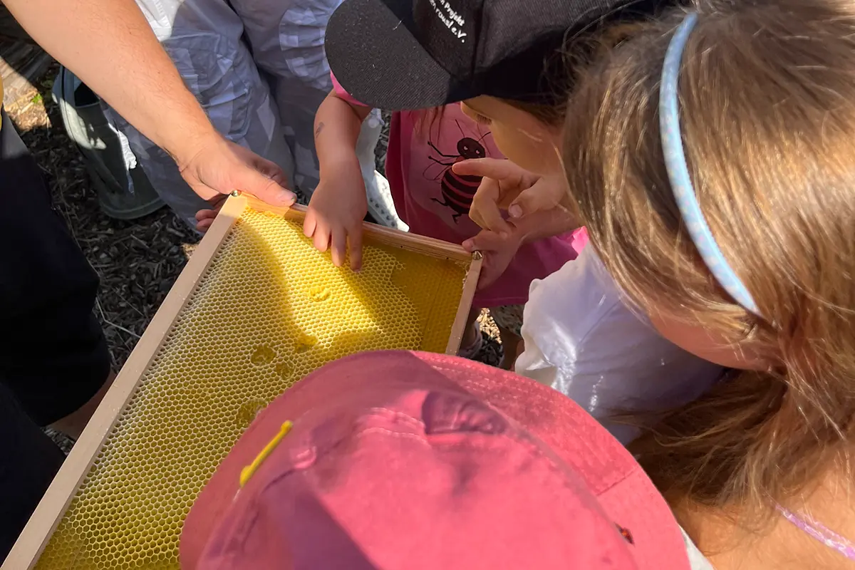 Hier hat der Verein „Wir gehen raus e.V.“ gemeinsam mit Kindern einen Bienengarten angelegt – Pflanze für Pflanze, Beet für Beet, alles für die Bienen. Eines unserer Völker steht mittendrin. Die Kinder können direkt zusehen wie ihre Gartenarbeit wirkt. Das ist kein Schulprojekt – das ist echte Imkerei für echte Neugier.